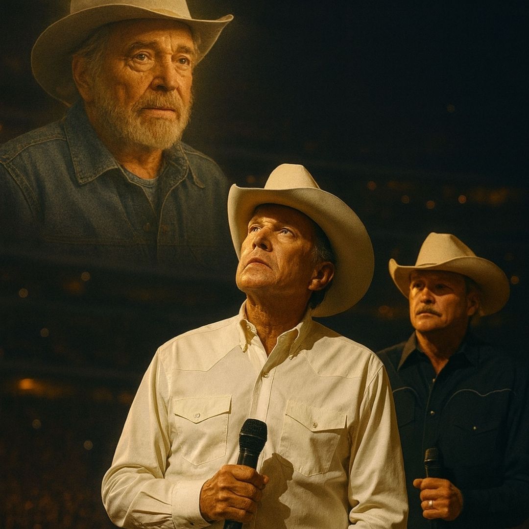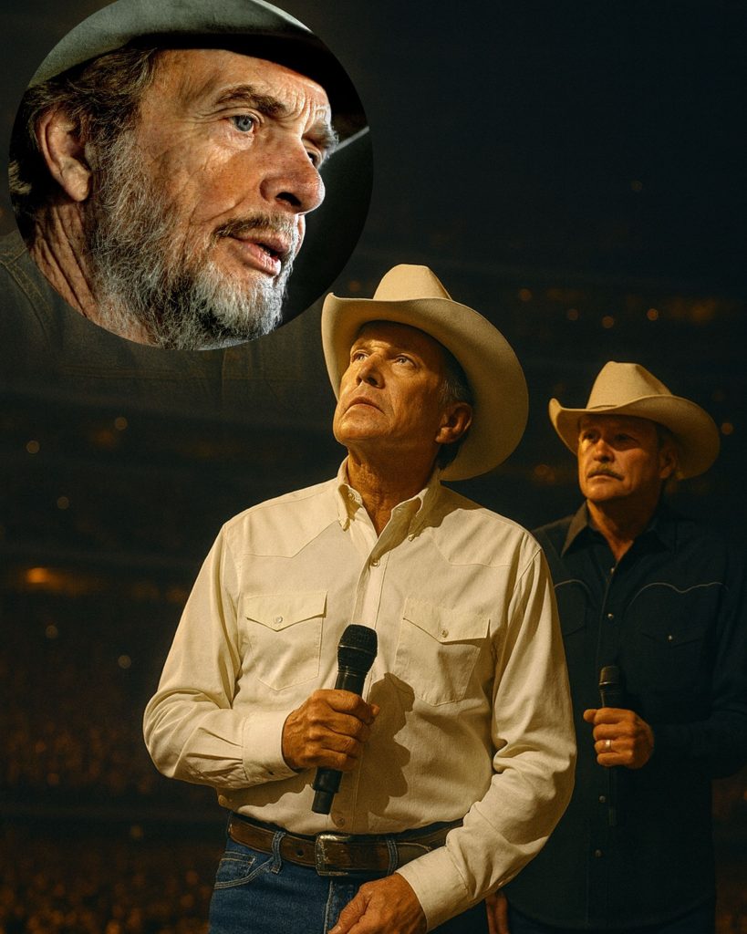To the crowd, it was more than a passing tribute. It was a reminder that country music is a family, one built on sweat, heartache, and the voices of those who came before. Merle Haggard — outlaw poet, rebel soul — had been gone from the stage for years, but in that moment, his shadow seemed to walk alongside George and Alan.