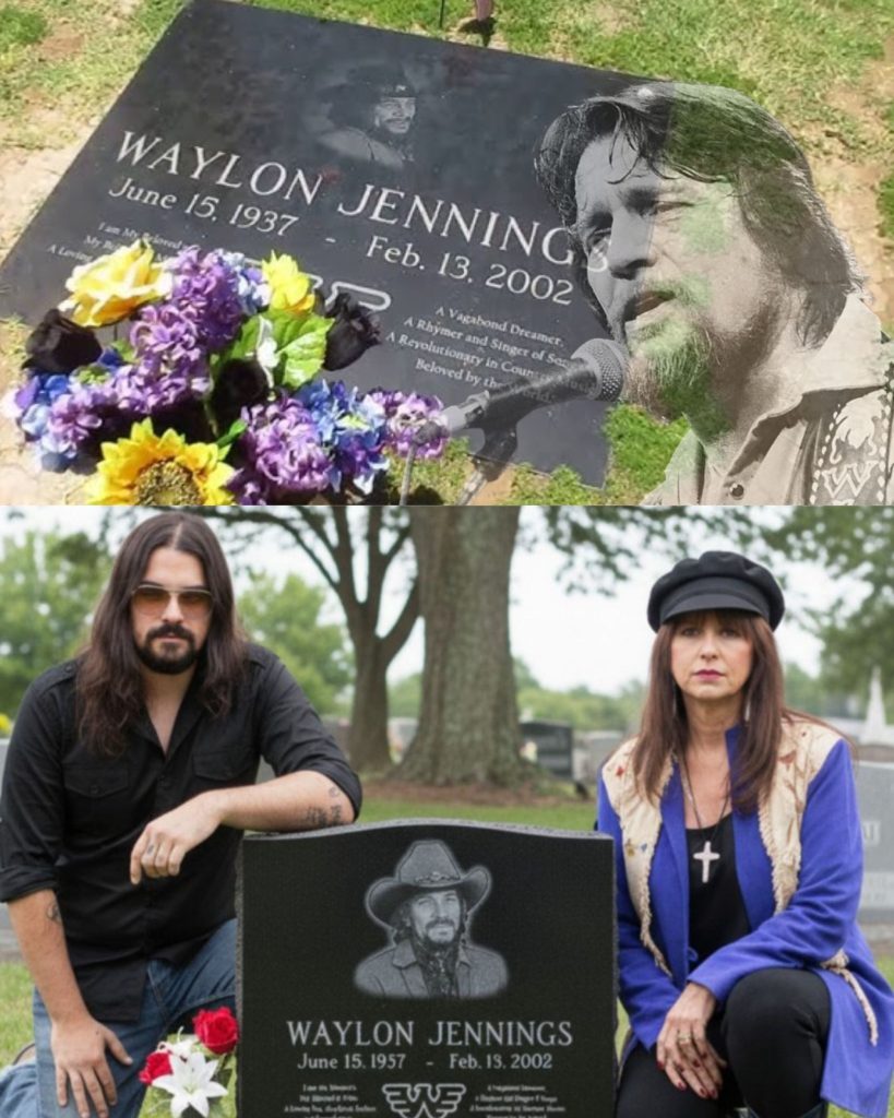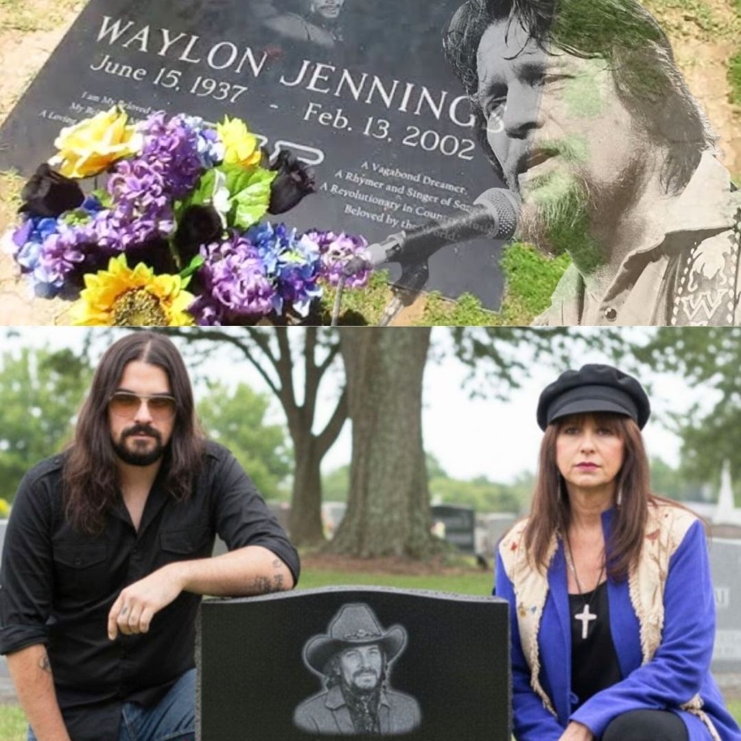 In the quiet stillness of a Tennessee afternoon, two figures knelt by a simple yet powerful monument. The headstone bore the name Waylon Jennings, one of country music’s most legendary voices. Standing there was his wife, Jessi Colter, and their son, Shooter Jennings—both carrying the weight of memory, music, and family.