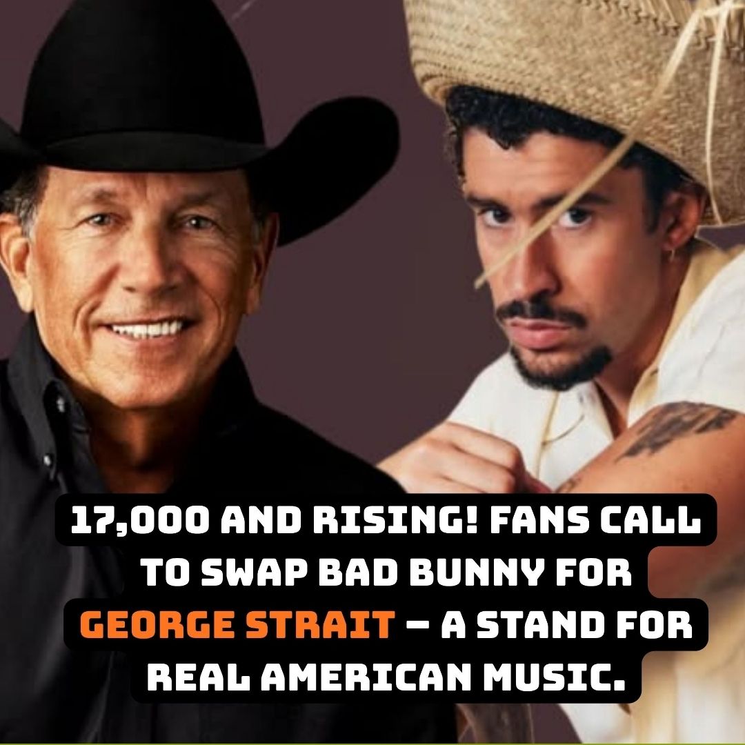 Just moments ago, a grassroots petition calling for country legend George Strait to replace Bad Bunny as the featured performer for Super Bowl LX’s halftime show officially surpassed 17,000 signatures — and the number continues to climb by the minute. What began as a small online campaign among traditional country fans has now erupted into a nationwide cultural movement.